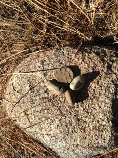 I found myself slowing up my pace to just LOOK and smell and feel and then engage…picking up rocks outside the trail and placing them lovingly in with the pattern of things. I did take some off trail routes and YES I did climb the highest hill I could find and I stood at the top and beat my chest a little. But along the way I collected little flat smooth rocks and made a couple flower mosaics in the dirt and stacked tiny cairns, thinking that this was almost as good as being at the river where Maria and I spent hours this summer stacking healing, flat river rocks in the hot sun.