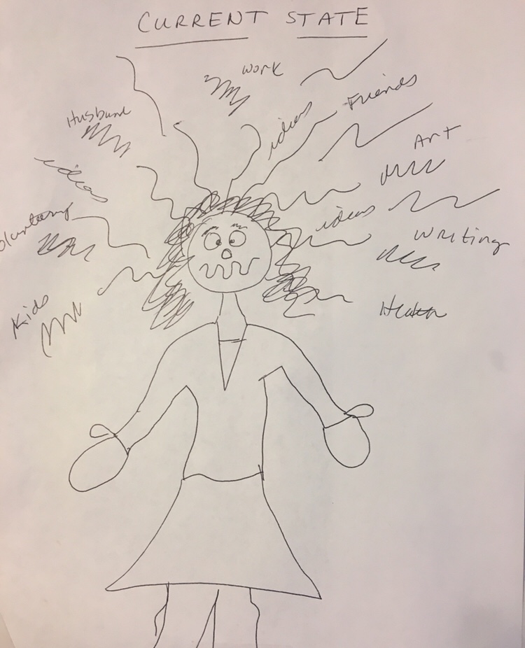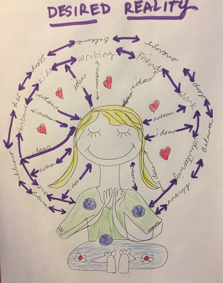 We did this fun activity where we were asked to draw our current state of reality and then our desired reality. There were no rules. Just coloring. Which is my jam. My talentless jam. Which is why it’s my jam: zero performance pressure.