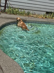 He spent a month jumping for buoys in the pool with Bella before it started to get too hard for him to breathe when swimming competitively. Now he just takes a dip whenever he wants and gets on the couches wet and gets a frozen two inch soup bone every single night (along with his two partners in crime) at exactly 5:30 pm.