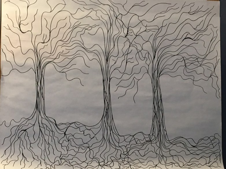 I found myself drawing the tree. I can’t draw but I thought, well maybe I’m supposed to try. It’s not like I am doing anything ELSE that feels interesting. Something about the roots. Drawing them felt so soothing. Cathartic. So I said “okay” and drew the trees. For days.